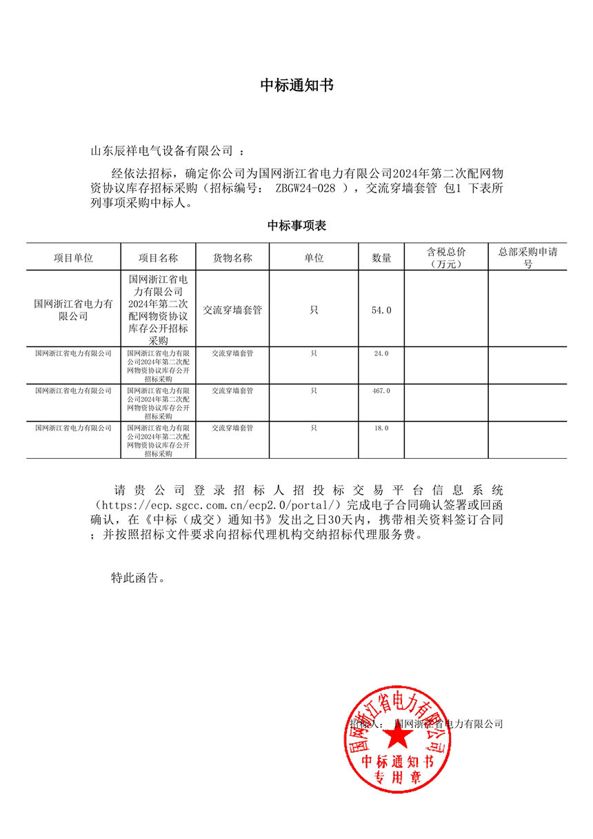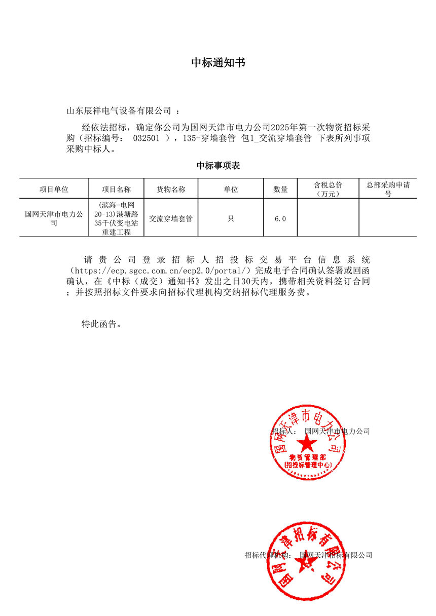 • 2025.02.14 110kV瓷絕緣穿墻套管中標通知書